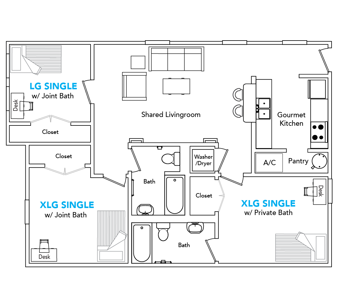 | XL Single w Priv Bath | $1199/mo | 2 Left For Fall 2026 | Reserve |